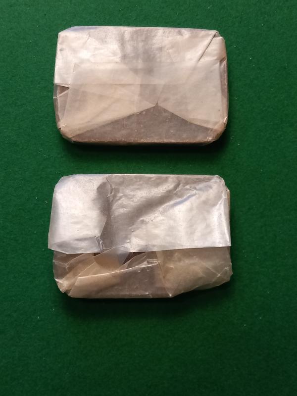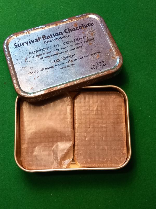A very hard to come by post war Survival Ration Tin. complete with 2 remaining blocks of fortified chocolate still wrapped. Perfect kit display item for an S.A.S jungle belt kit
