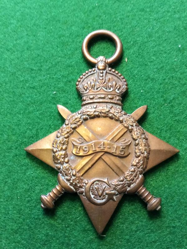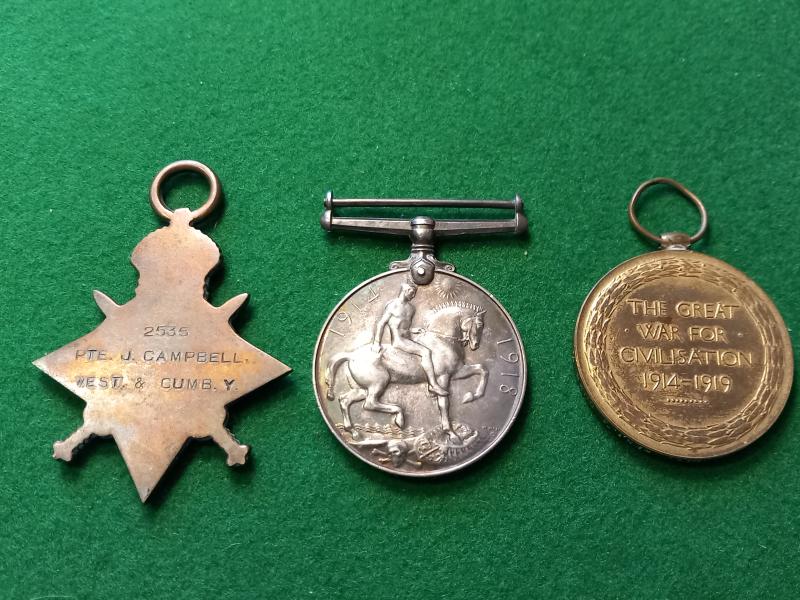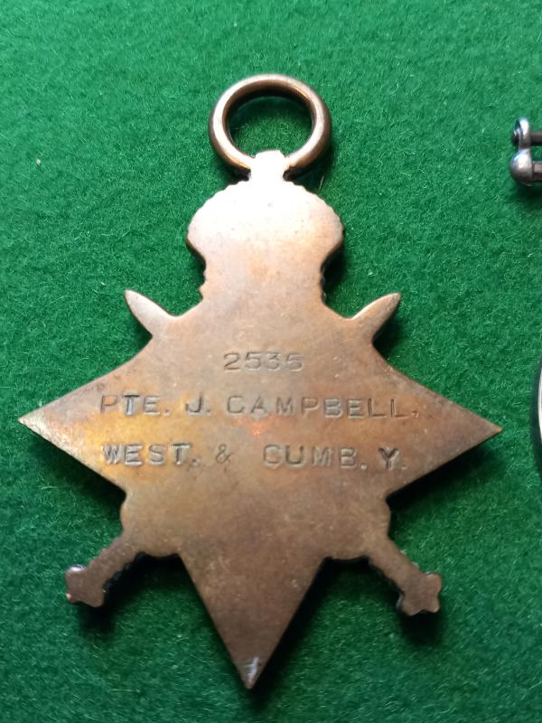 1914/15 Star,Silver war & Victory . 2535 Pte J.CAMPBELL. Medals in fine condition , ribbons absent. Medals offered with large original photo of Campbell