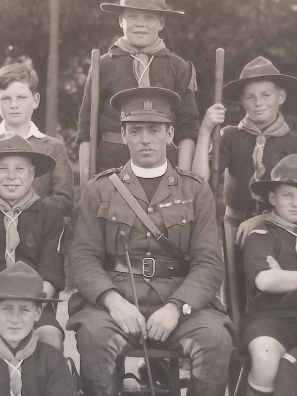 Original post card photograph. Military Padre with Military Cross ribbon and a group of Boy Scouts. Good clean condition.